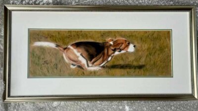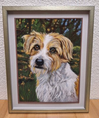 Auch das Pastell "Easy im Galopp" hat die Besitzerin des Hundes wunderschön rahmen lassen. Der grüne Rahmen nimmt die Farbe des Grases auf und auch der grüne Streifen am Passepartout umrahmt das Gemälde perfekt.